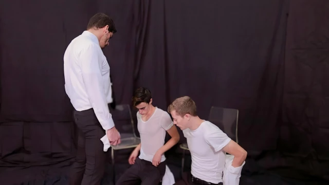 Bossy president Roderick takes over the scene, his dick pounding as he fucks Floyd's ass. The fleshy sound is all too audible as Aaron watches, his own cock swelling in time with each thrust. And the presidents grip tightens as his cock plunges in and out of Floyds hole aarons eyes widening in excitement. The Tight AF threesome energy is en fuego and you will be left wanting more.